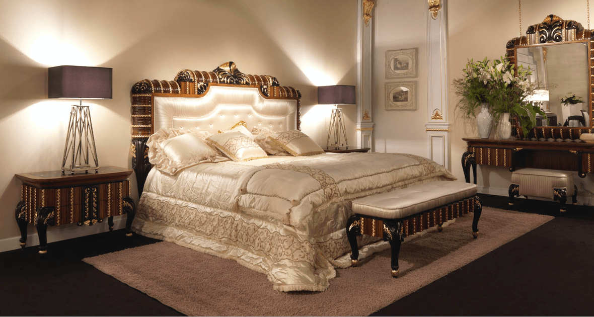 кровать- cm 238x161xh.215 2 тумбы-cm 85x51xh.61 туалетный стол-cm 205x50xh.70 пуф-cm 50x50x35 зеркало-cm 110x15xh.150 панка(скамейка в изножье)-cm 140x41xh.46